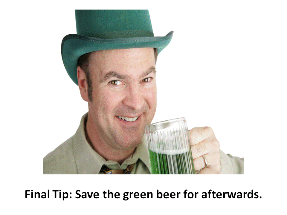 If you plan on jig-gin with the Irish this Saturday, make sure you’re early morning wakeup call allows ample time to hydrate and reenergize from the evenings fast. If your race is at 9AM, the latest you should be rising to shine is 5:45 for solids or 6:45 for liquids. Good solid choices include a small bowl of cereal, a lightly topped bagel, 2 small pancakes, a low-fat fruited muffin, or a breakfast bar. Avoid high fiber foods like bran cereal or too much dried fruit because they’ll leave you cramped. No fried hash browns or greasy breakfast meats because they slow down digestion and are a poor source of energy. Drink 2 cups of fluid, 2 hours before your race to top off your bodies fluids but still give adequate time to rid yourself of any excess. Good fluid combinations include 1 cup of water and 1 cup of sports drink, coffee, smoothie, milk or juice. Drink another 1 cup of fluid 15 minutes prior to your race and you should be good to run. With that said, don’t experiment on race day and may you pass the dude in the leprechaun outfit!