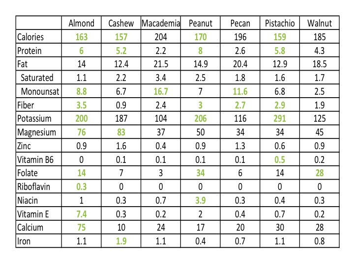 Nuts are a great way for you to increase the nutrient density of your diet and improve your heart health in one crunchy bite. Nutrient density is measured by the amount of vitamins and minerals contained in a food or beverage per calorie consumed. The 2010 Dietary Guidelines suggests we Americans need to swap out our high calorie, nutrient poor choices with selection that are more nutrient dense. Check out the chart below to see what vitamins and minerals are in your favorite nut. All servings are based on one-ounce portions.