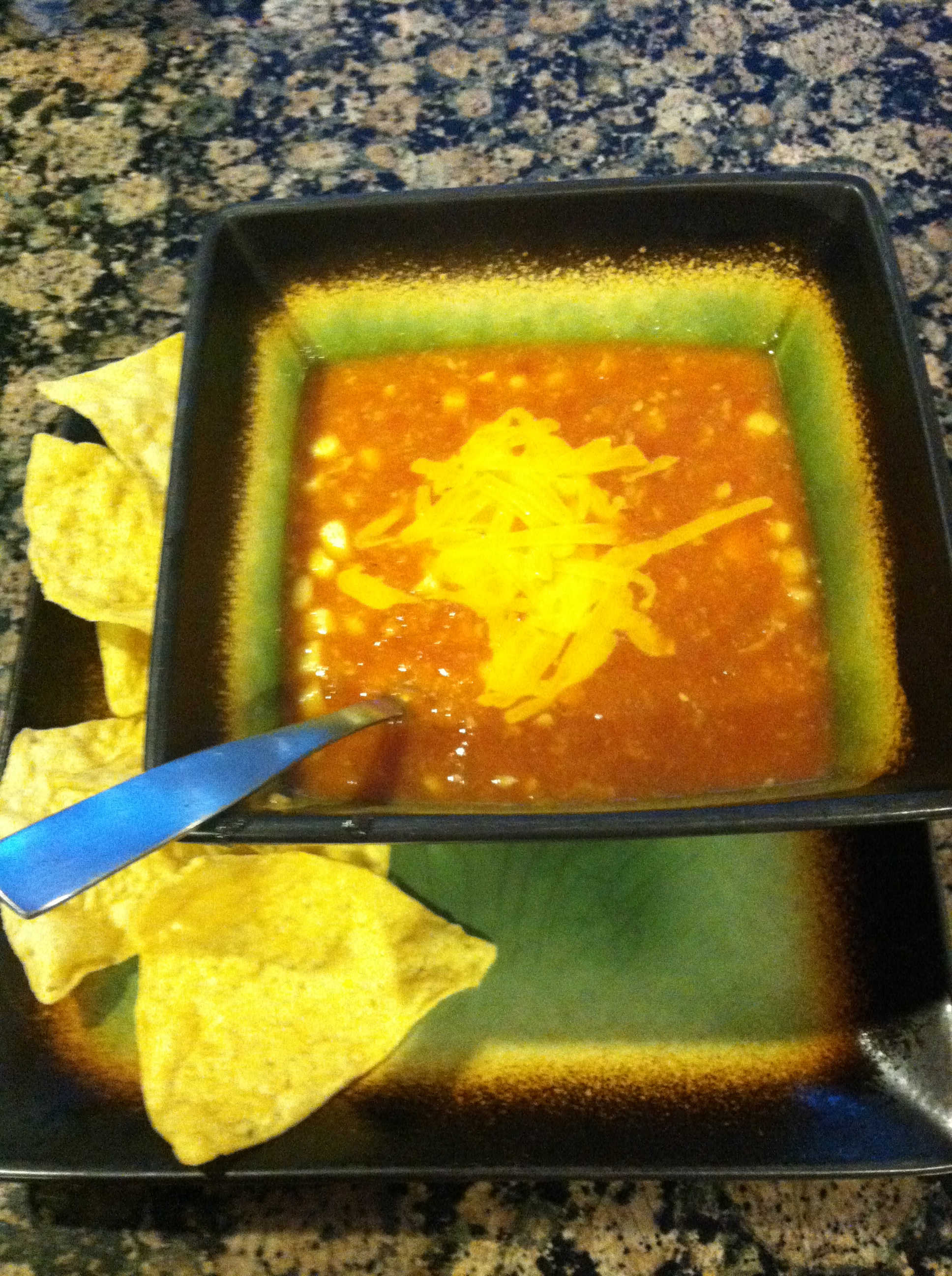 Tortilla chips, shredded Sharp Cheese, and Fresh Cilantro make excellent edible garnishes.
