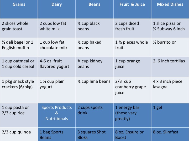 - Load up on carbohydrates. While my diet is always carbohydrate rich to fuel endurance training, from Thursday – Saturday, I’ll up the content to 10-12 grams/kilogram/day. Example: 160 pound person/2.2 pounds per kilogram = 720-875 grams of carbohydrate/day. Here is a list of foods that contain an average of 25 grams of carbohydrate per serving.