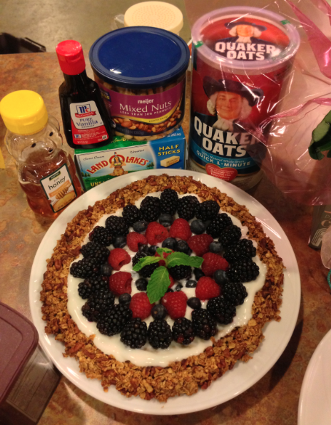 - Press mixture into a 10” tart pan that has been coated with non-stick cooking spray. Use a measuring cup to help press the granola evenly over the bottom and up the sides.