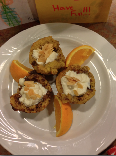 This recipe has fun written all over it! Kids love topping these muffin cups with their favorite items and it includes all but the vegetable food group! The high protein content in these tasty cups, come from eggs, skim milk, low fat ricotta and almonds.