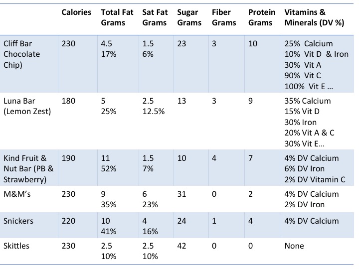 You can imagine my surprise as I entered the check out lane at our local grocery store only to see that the candy aisle has been hijacked by Cliff, Luna and Kind Fruit and Nut Bars. Are these so called energy bars a wolf in sheep’s clothing or are they indeed a healthy alternative to M&M’s, Snickers and Skittles? I purchase Cliff bars as a useful energy source when I’m preparing for long runs or during a triathlon. However, I have to admit I cringed when I saw wee folks and moms tossing them on the grocery belt in lieu of a candy bar. Was my concern unwarranted? Let’s compare the nutrition facts, and I’ll let you be the judge.