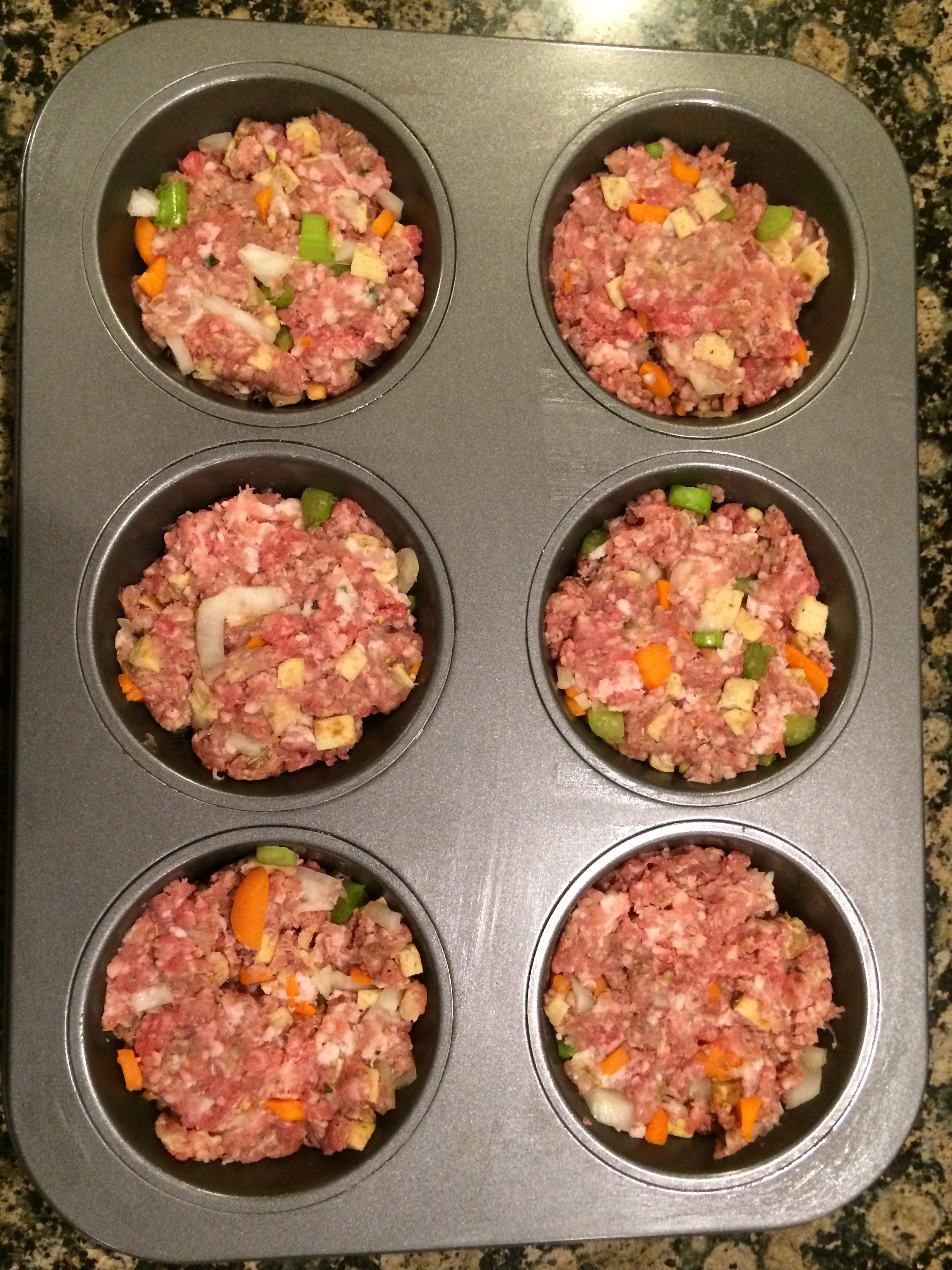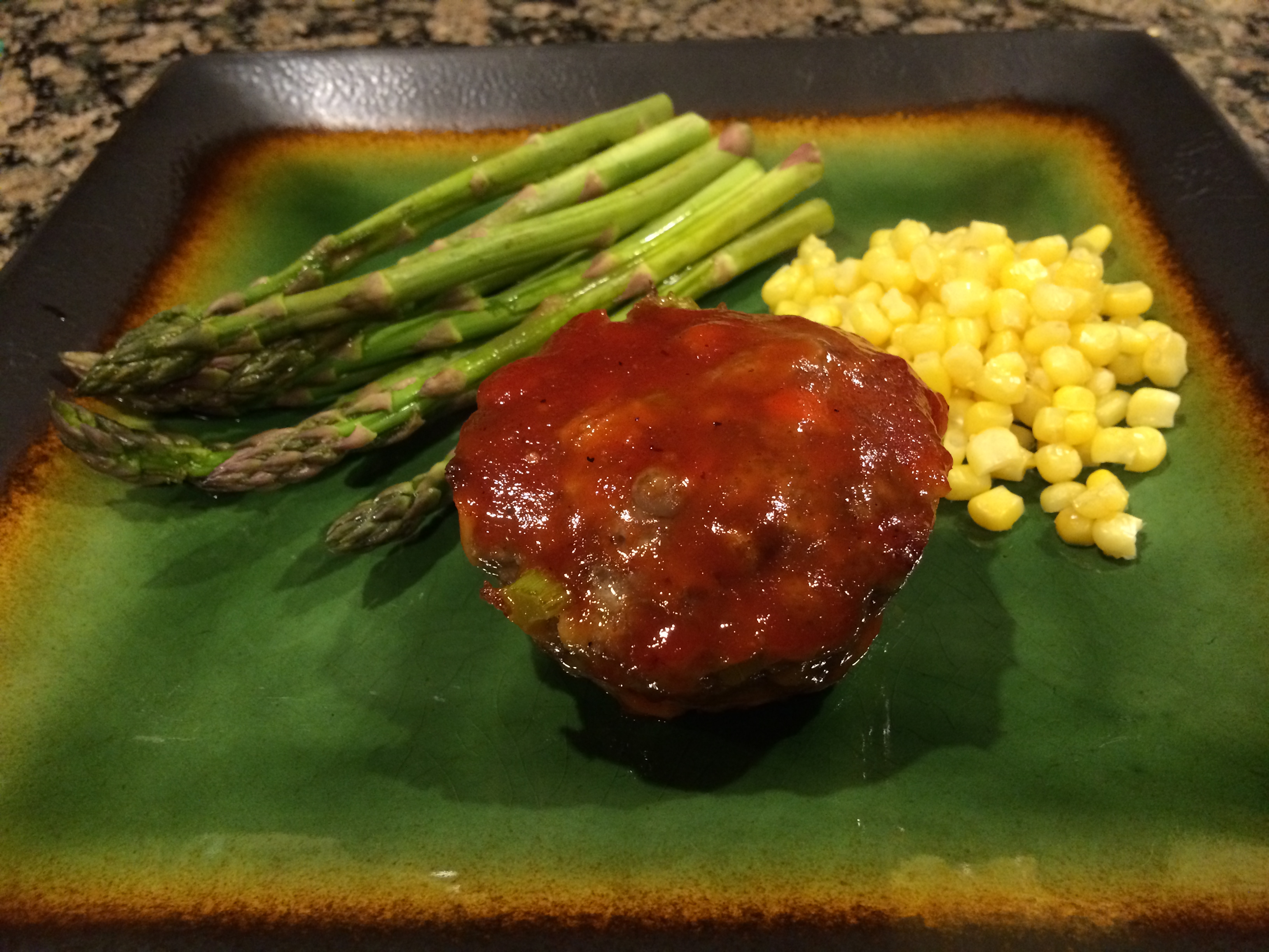 We love meatloaf at our house, be it turkey, lean beef or lean beef with pork blend and there are many ways to jazz up tradition.  Here it’s shown in an oversized cupcake pan, yet I’ve also made it in a bundt cake pan served with smashed potatoes in the inner circle.  Both make for a tasty presentation.  Here’s today’s recipe which serves 6.