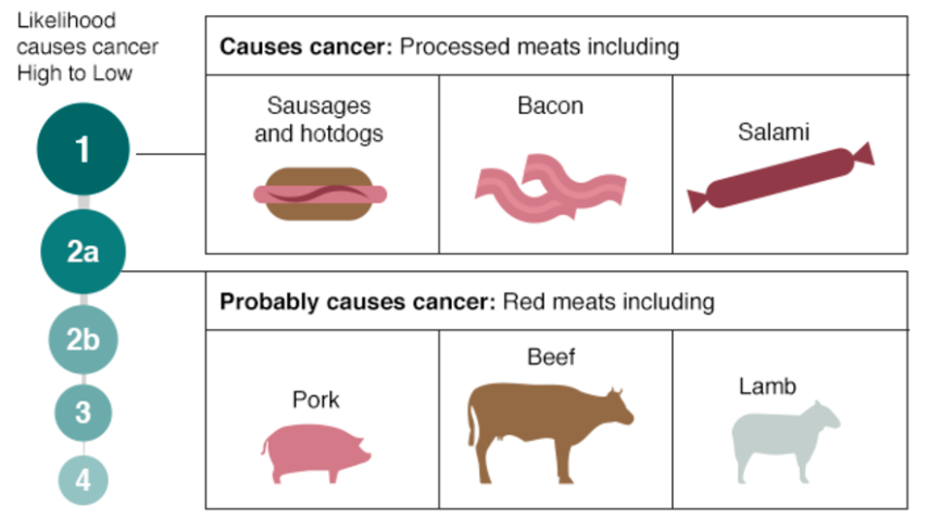 Processed meat was classified as carcinogenic to humans (Group 1) based on sufficient evidence in humans that the consumption of processed meat causes colorectal cancer.