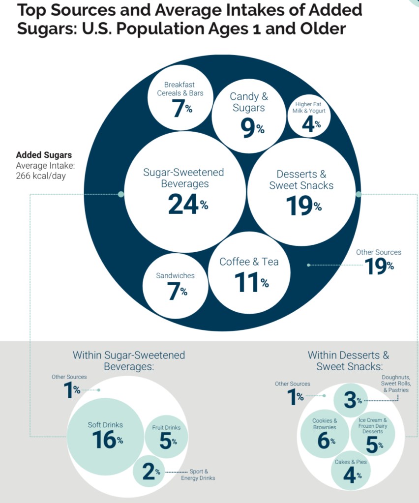 Liquid sugar tops the charts contributing 35% of added sugars in the form of soda, energy drinks, fruit drinks and gourmet coffees and sweet teas. This chart published in the DGA breaks down the top sources of sugar, including a deeper dive into the top two offenders, beverages and desserts.