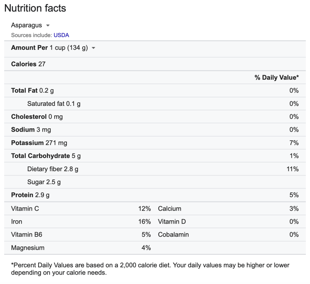 Grilled Asparagus. Asparagus season is just around the corner and this recipe is as simple as it gets. https://www.foodiecrush.com/grilled-asparagus/ Look at all that fiber, iron, Vitamin C, potassium and taste!